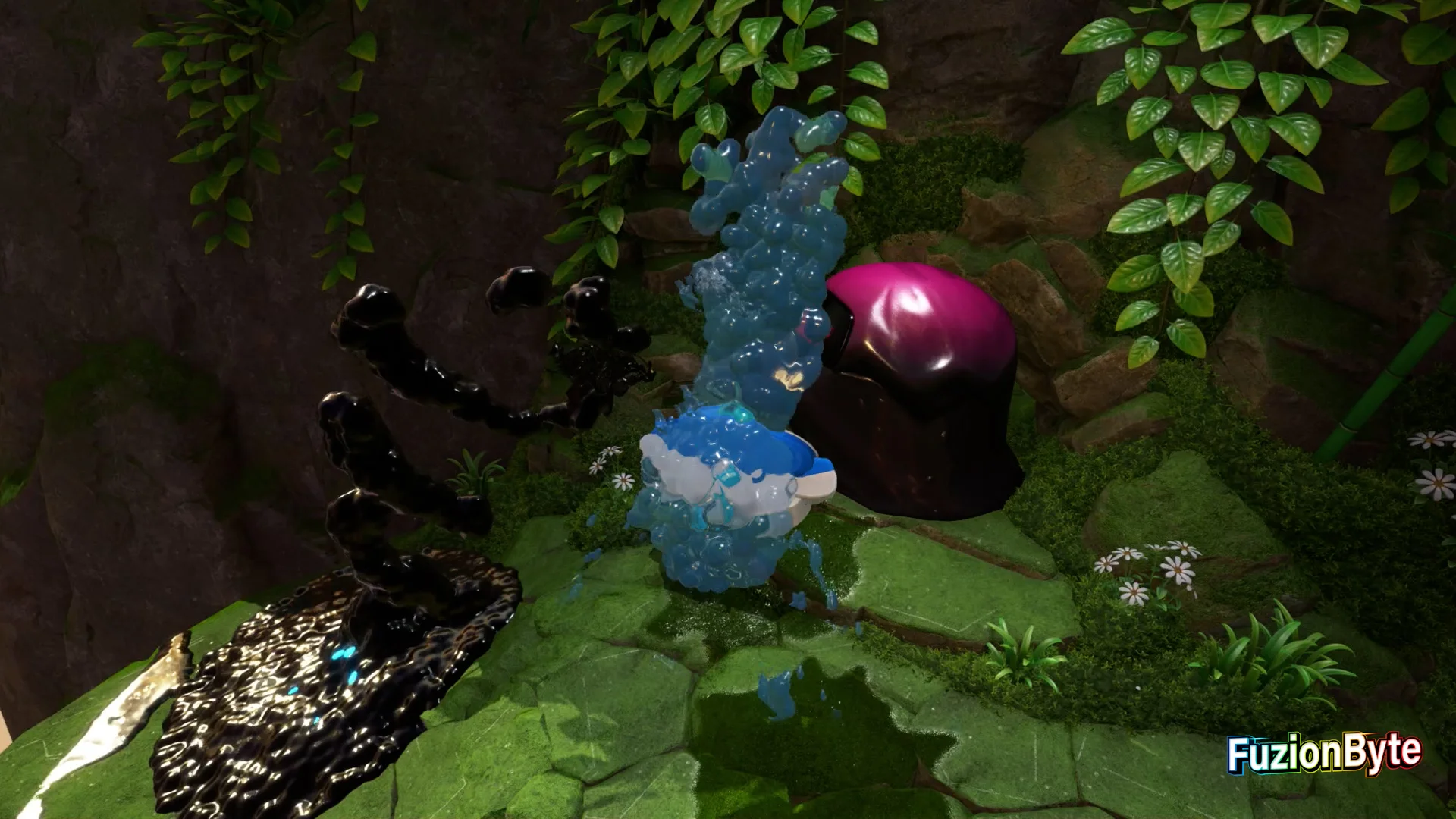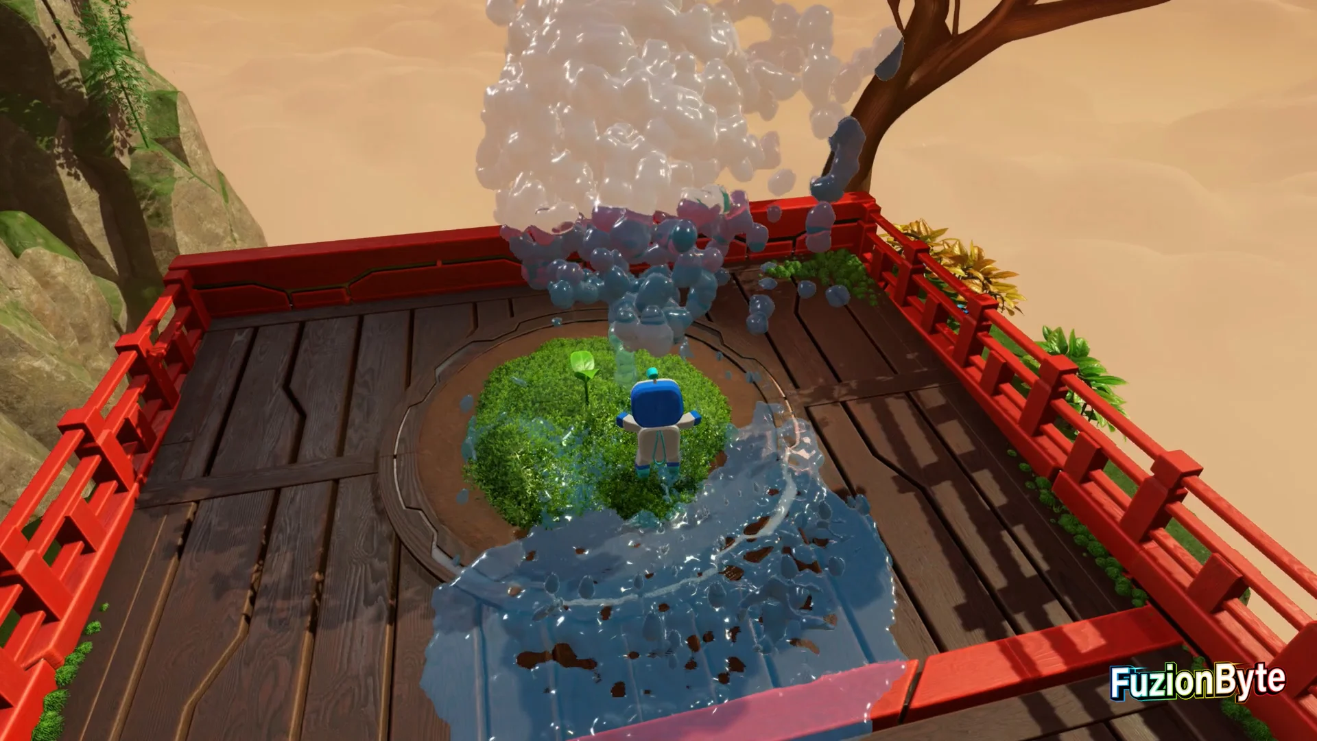Perform a charged punch on the flower to release a water source, jump in growing big then go to the left to find a shrub in a grass circle. Squeeze your water out to make a giant stalk appear you can use the leaves to jump up.
