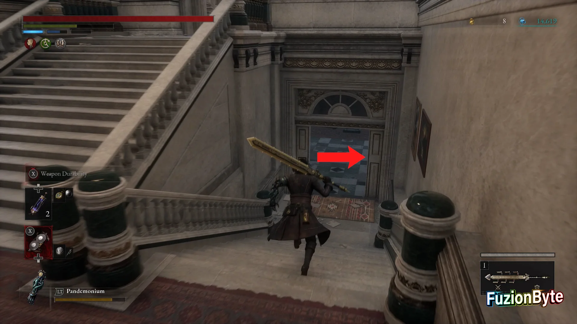 Initially, when you are going through the St. Frangelico Cathedral Chapel ensure you open the shortcut by pulling the lever at the top of the area which changes the direction of the platforms. Refer to the St. Frangelico Cathedral Chapel shortcut if you aren’t sure where to find it then proceed through to Chapter 5, Malum District. Head through the Malum District pass the Elite patrolling the courtyard near the bonfire then continue through the area to where you enter a room and are immediately attacked by a Carcass enemy with a large metal bar and another Carcass drops down to join the fight.