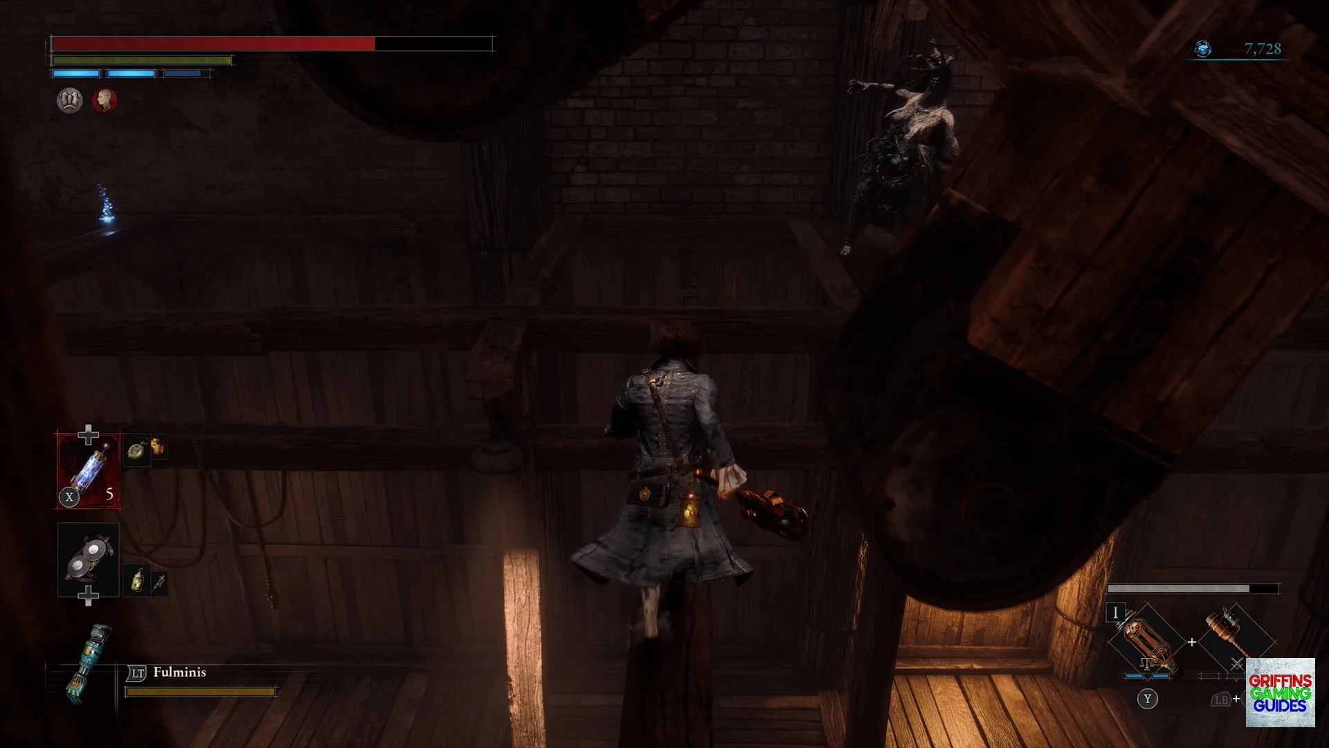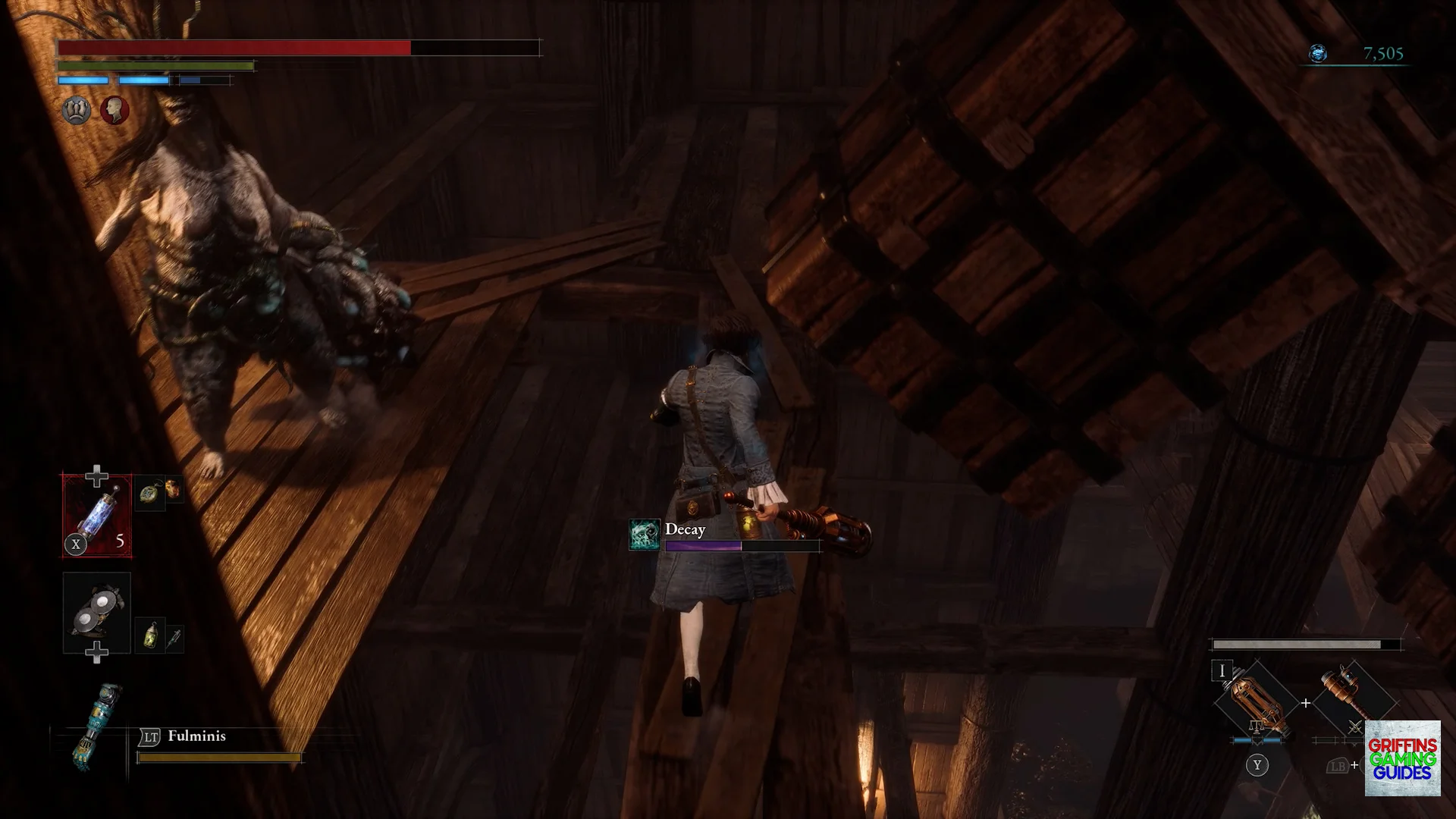 Continue along the platform luring the Carcass enemy to you, dash back then slash it to kill it where you can then start crossing the final set of beams where you will again have a Brute throwing Decay at you so move quickly to the platform.